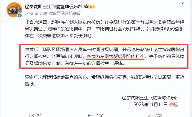 深夜,辽宁沈阳三生飞豹篮球俱乐部发布了赵继伟伤情最新消息,球队及现场医护人员迅速将赵继伟送往指定医院进行详细检查。经医院初步诊断,伤情为左侧大腿后侧肌肉拉伤。输了比赛还伤了人,真是一大不幸。这让赵继伟和辽宁带来了麻烦,与四川队第三名的争夺战,他是打不了,如果伤情恢复得不顺利,或许新赛季暂时赶不上。